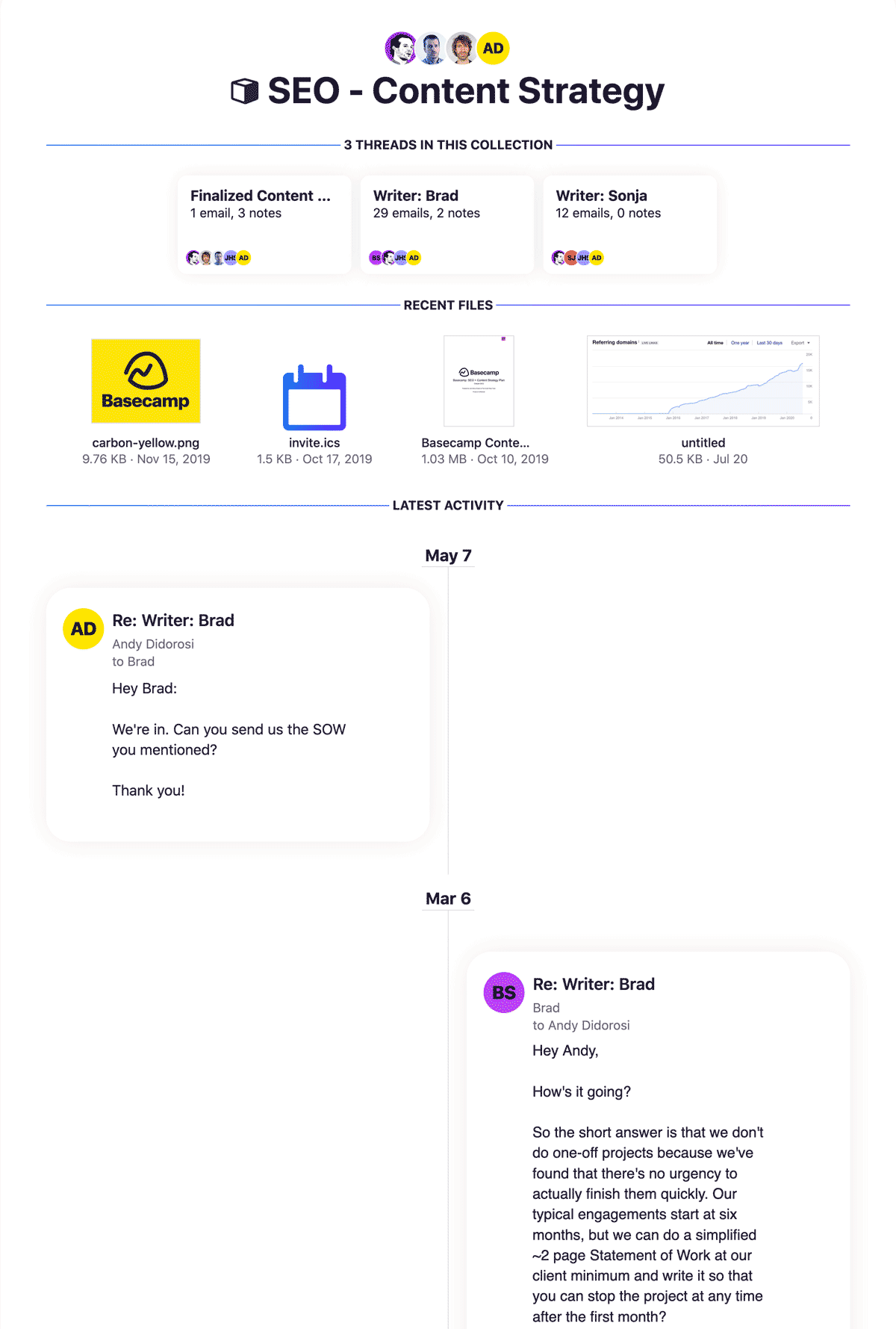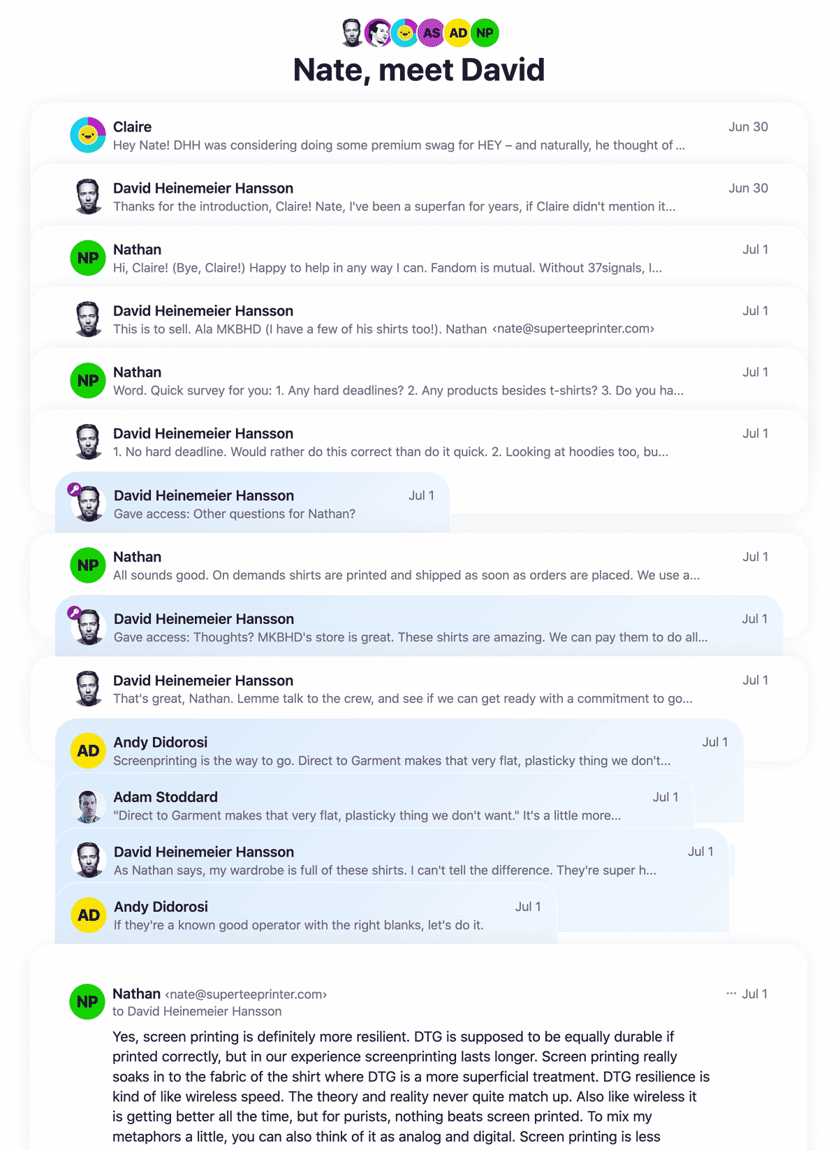 HEY fixes this by letting you add multiple threads to a single Collection — automatically organizing the entire conversation on one page. Sharing the Collection with someone else on your account instantly grants them access to everything without forwarding, cc’ing, or ruining their day. It’s a revelation in sharing, reading, and working together.