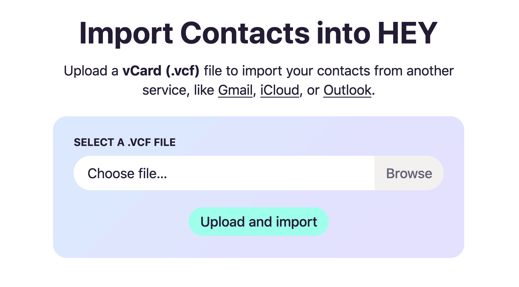 Last, head over to the contacts importer in HEY, choose the file you exported from Google, then click the “Upload and import” button.