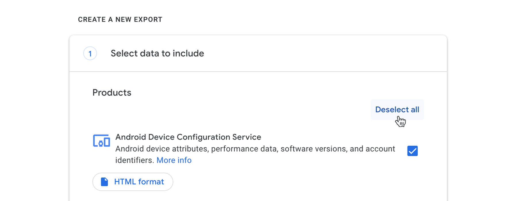 First, visit Google Takeout, and click the “Deselect all” button at the top.