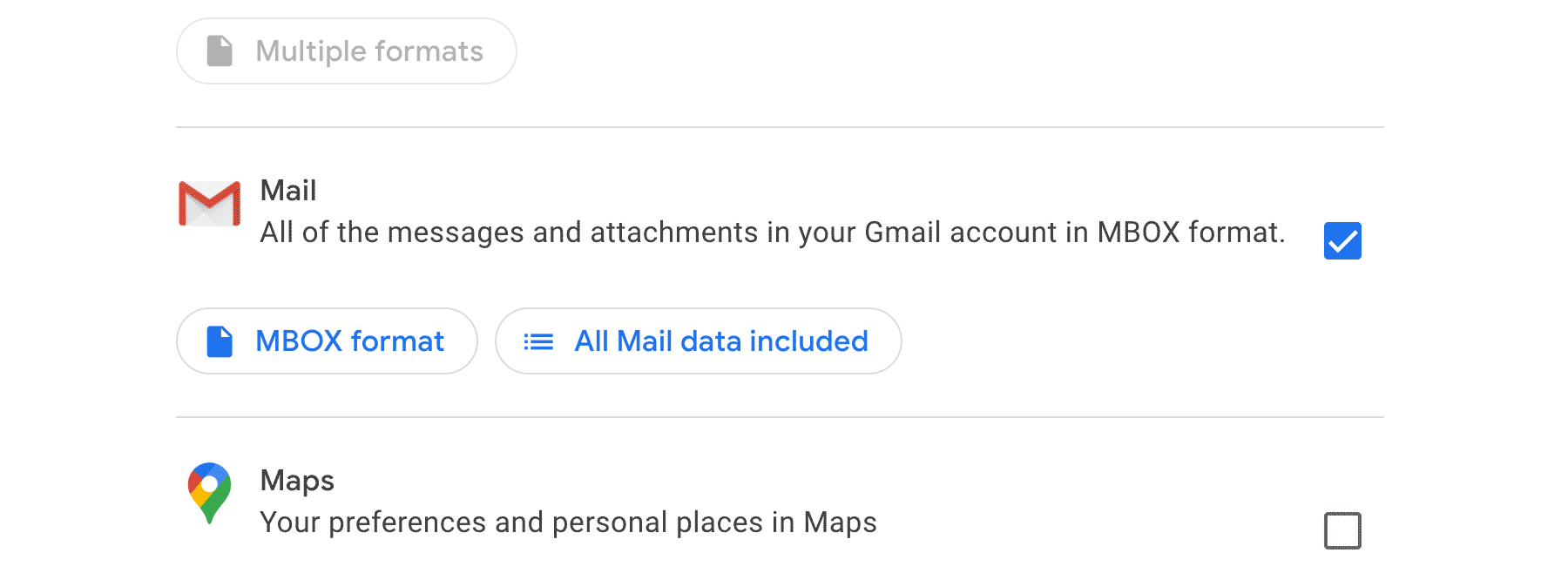 Then, scroll down to “Mail” and check the box next to it. If you only want some of your email, click the “All Mail data included” button and select the labels you want to export. When you’re ready, scroll down to the bottom of the page and click the “Next step” button.
